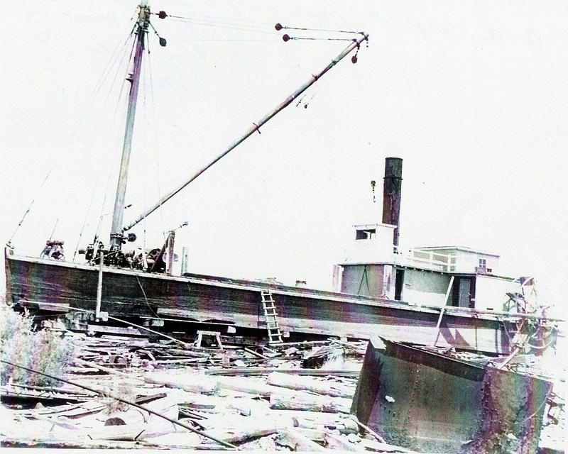 This paddlewheel drogher, originally from Ballina, was purchased by Stan Phillips to transport logs from Meyers Point and Bulahdelah back to the mill at Oyster Cove. The winching gear was transferred from ex-wartime ships moored at Stockton prior to scrapping.